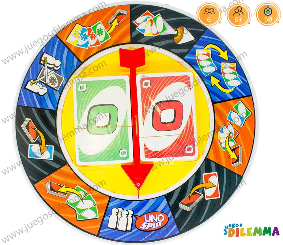 Uno Spin ¡El juego clásico de cartas UNO se revoluciona! Cuando sale una carta de Spin, uno de los jugadores deberá girar la rueda, en tan solo un turno.